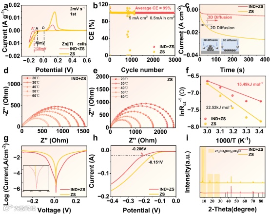 图4.(a) Zn||Ti半电池在ZS和IND+ZS电解质中的CV表征;(b)不同电解质在5 mA cm-2和0.5 mAh cm-2时的库仑效率(CE);(c)Zn2+在不同电解质中的扩散和沉积CA曲线;(d) IND+ZS中对称电池的Nyquist图;(e)不同温度下ZS电解质的Nyquist图;(f)相应的Arrhenius图和活化能比较;(g)在Zn||Ti半电池中以1 mV s-1速率进行LSV扫描;(h) ZS和IND+ZS电解质中Zn电极的Tafel图;(i)锌箔在不同电解质中浸泡7天的XRD谱图。