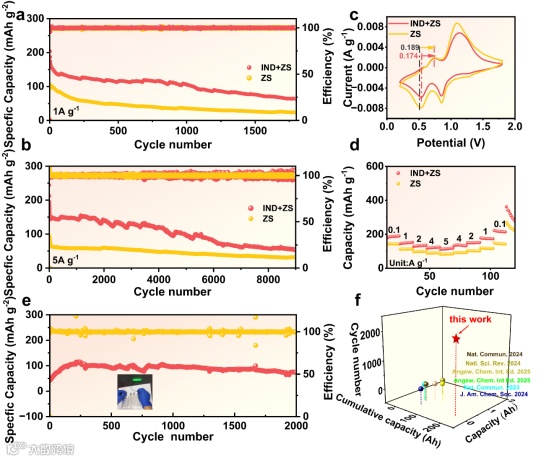 图6a和6b所示,分别在1 A g-1和5 A g-1电流密度下,加入IND后的全电池容量保持率相较于未加入的有明显的提升,体现出良好的全电池循环性能和可逆性。并且在进行倍率性能测试时,图6c所示的 CV曲线中两种电解液的峰形相同,证明了IND添加后不会影响ZVO的氧化还原过程。图6e的软包性能循环图进一步证明了加入IND后对电池性能的改善。