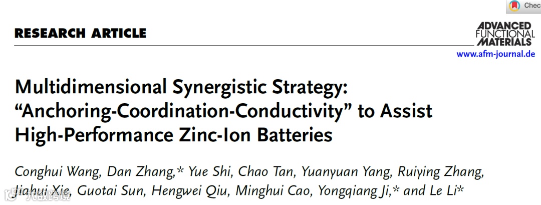 近日,来自陕西理工大学的张丹教授,在国际知名期刊Advanced Functional Materials上发表题为“Anchoring - Coordination - Conductivity” to Assist High-Performance Zinc-Ion Batteries”的研究工作。