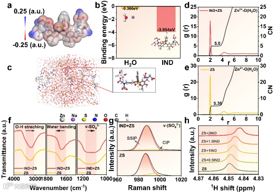图1. (a) IND分子静电电位图;(b)结合能的DFT计算;(c) IND+ZS电解质和Zn2+溶剂化结构单元的MD模拟快照;(d) IND+ZS和(e) ZS电解质、RDF和CAN中的Zn─O(H2O,IND);(f)不同IND含量的傅里叶变换红外光谱;(g) ZS和IND+ZS的v-SO42-区拉曼光谱;(h) ZS、0.5IND+ZS、1IND+ZS、1.5IND+ZS、2IND+ZS的1H(D2O) NMR谱。
