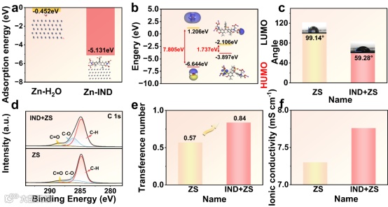 图2. (a) H2O和IND分子在Zn金属表面的吸附能比较;(b) ZnSO4(H2O和IND分子)的HOMO和LUMO能级;(c)锌箔在不同电解质中的接触角图像;锌箔在IND+ZS和ZS电解液中循环50次后的高分辨率XPS光谱:(d) c15;(e) ZS和IND+ZS的离子迁移数;(f) ZS和IND+ZS的电导率