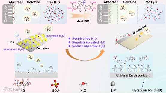 IND分子通过其羧基(─COOH)、羟基(─OH)和磺酸基(─SO3H)与锌离子(Zn2+)之间的相互作用。在分子动力学模拟中,我们观察到IND分子通过其负电荷区域(特别是羧基和磺酸基团)与Zn2+形成了稳定的配位复合物,改变了锌离子的溶剂化壳结构。图中进一步展示了Zn2+在纯ZnSO4电解液中和加入IND后,溶剂化结构的变化。通过IND的协同作用,Zn2+溶剂化水分子的比例被降低,从而减少了溶剂水与电极之间的反应性,有效地避免了沉积不均、树枝晶的生长。