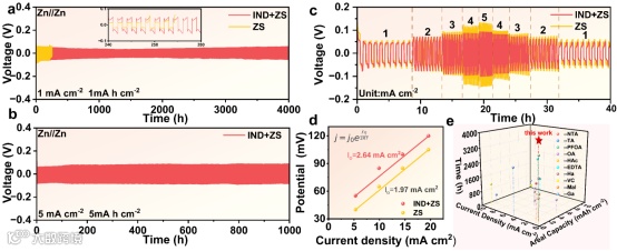 图3. (a) ZS和IND+ZS电解质在1mA cm-2电流密度和1mAh cm-2比容量下Zn||Zn对称电池的循环性能;(b)对称电池在5mA cm-2和5mAh cm-2下的循环性能;(c) ZS和IND+ZS电解质在电流密度为1~5 mA cm-2、比容量为1 mAh cm-2时的倍率性能;(d)交流电流密度;(e)本研究中对称细胞性能与其他报道的添加剂的比较。