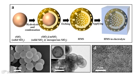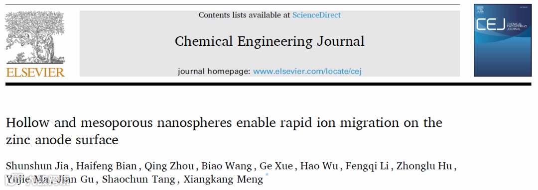 基于此,来自南京大学的孟祥康教授课题组在国际知名期刊Chemical Engineering Journal上发表题为“Hollow and mesoporous nanospheres enable rapid ion migration on the zinc anode surface”的研究性文章。该工作引入了一种具有中空介孔的纳米二氧化硅颗粒(HMS)作为阳极涂层,有效抑制副反应的发生和促进离子迁移。
