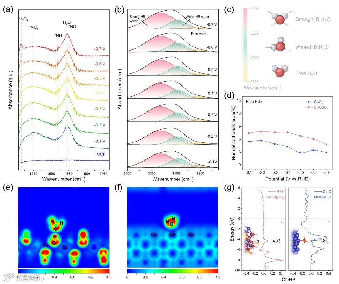 原位拉曼和原位红外检测NO3RR反应过程中的中间产物。此外,原位红外测试结果表明Cr掺杂可以有效调节界面水结构,从而增加高活性自由水的相对含量。结合理论计算表明,Cr-Co(OH)2表面羟基与界面水分子形成强氢键,促使H2O网络中形成更多的自由水参与NO3RR中的加氢过程,促进NO3转化为NH3(图5)。