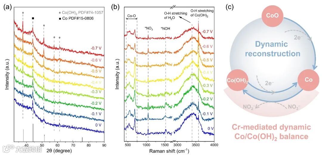 原位拉曼测试结果验证了NO3RR反应过程中的Co(OH)2形成。原位XRD结果表明,随着反应电位的负移,Co(OH)2衍射峰强度逐渐增强,而金属Co衍射峰强度逐渐减弱;当施加电位达到-0.4 V vs. RHE后,Co(OH)2与金属Co的XRD衍射峰强度保持相对稳定,表明Co(OH)2与金属Co之间形成动态平衡。根据上述原位测试结果,Cr-CoOx催化剂在NO3RR反应过程会发生动态重构过程,形成Co(OH)2与金属Co双组分之间的动态平衡(图4)。