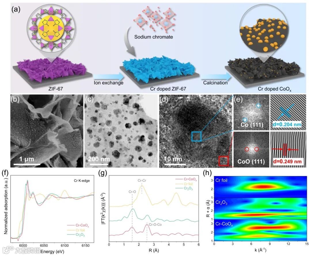 通过对ZIF-67采用离子交换法并结合随后的煅烧过程,形成了分散在氮掺杂碳基底的Cr掺杂CoOx纳米颗粒。在离子交换过程中,ZIF-67的配体被CrO42-部分取代;随后在氢/氩混合气氛煅烧过程中,Cr掺杂ZIF-67纳米片转变为Cr-CoOx颗粒。通过XANES和EXAFS研究了催化剂中Co的价态以及配位结构,证实了Cr的成功掺杂(图2)。