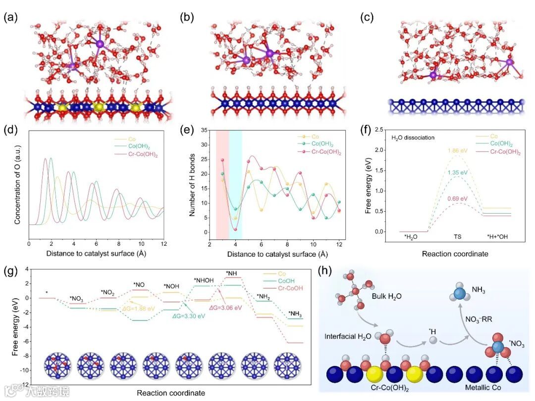 分子动力学(MD)模拟结果表明,Cr-Co(OH)2可以增强与界面水的分子相互作用并削弱水分子之间的氢键网络,促使更多的水分子参与加氢反应过程。密度泛函理论(DFT)计算表明,Cr-Co(OH)2可以促进H2O的解离以及*H的产生。与Cr-Co(OH)2和Co(OH)2相比,金属Co位点的NO3RR决速步骤的反应能垒更低。因此Cr-Co(OH)2与金属Co之间存在显著的协同效应:Cr-Co(OH)2表面发生H2O的解离并产生*H,促进金属Co位点上NO3加氢反应合成氨(图1)。
