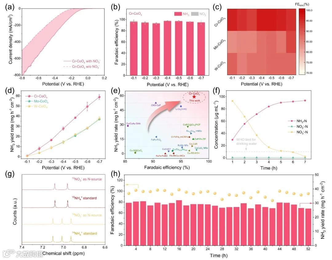 电催化NO3RR性能测试结果表明,Cr-CoOx催化剂在-0.4 V vs. RHE下的产氨法拉第效率达到97.36%,在-0.7 V vs. RHE下的产氨速率达到58.92 mg h-1 cm-2。产氨速率和法拉第效率在50小时的连续测试过程中保持相对稳定。其电催化NO3RR综合性能超过多数同期报道的催化剂(图3)。