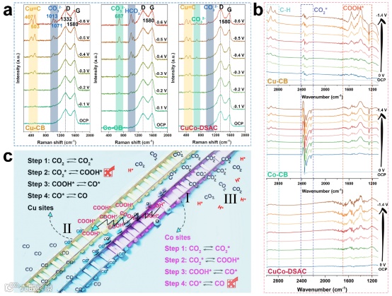 CuCo-DSAC的卓越性能源于Cu与Co位点在电子结构和空间分布上的协同调控。通过XAFS与XPS表征,Co原子以+2氧化态锚定于六配位Co-N₆位点,而Cu原子则以低氧化态(0 < δ < +2)嵌入四配位Cu-N4构型。DFT计算表明,Co位点通过其适中的d带中心优先吸附并活化CO2分子,显著降低COOH中间体形成能垒,这一过程通过原位ATR-SEIRAS光谱中增强的COOH信号得到实验验证。与此同时,相邻的Cu位点通过电荷再分配,削弱CO吸附强度,促进CO快速脱附。这种“Co活化-Cu脱附“的动态溢流机制有效缓解了传统单原子催化剂中因中间体过度积累导致的活性位点阻塞问题。此外,Cu的电子调制作用协同抑制了竞争性HER反应,从而在宽达400 mV的电位窗口内维持>95%的CO选择性。这种双位点协同机制为多步电催化反应提供了全新的动态缓冲系统设计范式。