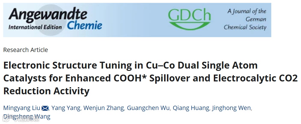 南开大学刘明阳、清华大学王定胜及合作团队在《Angewandte Chemie International Edition》发表题为“Electronic Structure Tuning in Cu–Co Dual Single Atom Catalysts for Enhanced COOH* Spillover and Electrocatalytic CO2 Reduction Activity”的研究论文。该工作通过可扩展热解法合成碳黑负载的Cu-Co双单原子催化剂(CuCo-DSAC),在工业级电流密度(500 mA cm⁻2)下实现98.5%的CO法拉第效率,并保持48小时稳定性(衰减<6%)。结合原位光谱与理论计算,揭示了Co位点活化CO2并稳定*COOH中间体、Cu位点促进CO脱附的协同机制,为设计高效CO₂RR催化剂提供了新范式。