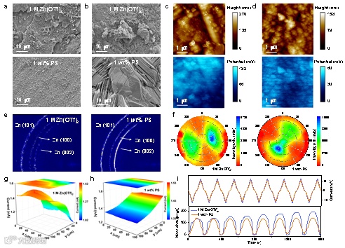 图2 PS对Zn2+沉积/剥离行为的影响研究。a 铜电极以及(b)锌电极在1 M Zn(OTf)2电解液以及含1 wt% PS的电解液循环50次的SEM图像。在1 M Zn(OTf)2电解液以及含1 wt% PS的电解液循环50次的锌电极的(c)AFM图以及(d)KPFM图。e锌电极在1 M Zn(OTf)2电解液以及含1 wt% PS的电解液循环50次的2D GIWAXS,以及(f)(002)极图。锌电极在(g)1 M Zn(OTf)2电解液以及(h)含1 wt% PS的电解液循环50次的SECM图像。i 在1 M Zn(OTf)2电解液以及含1 wt% PS的电解液中EQCM结果。