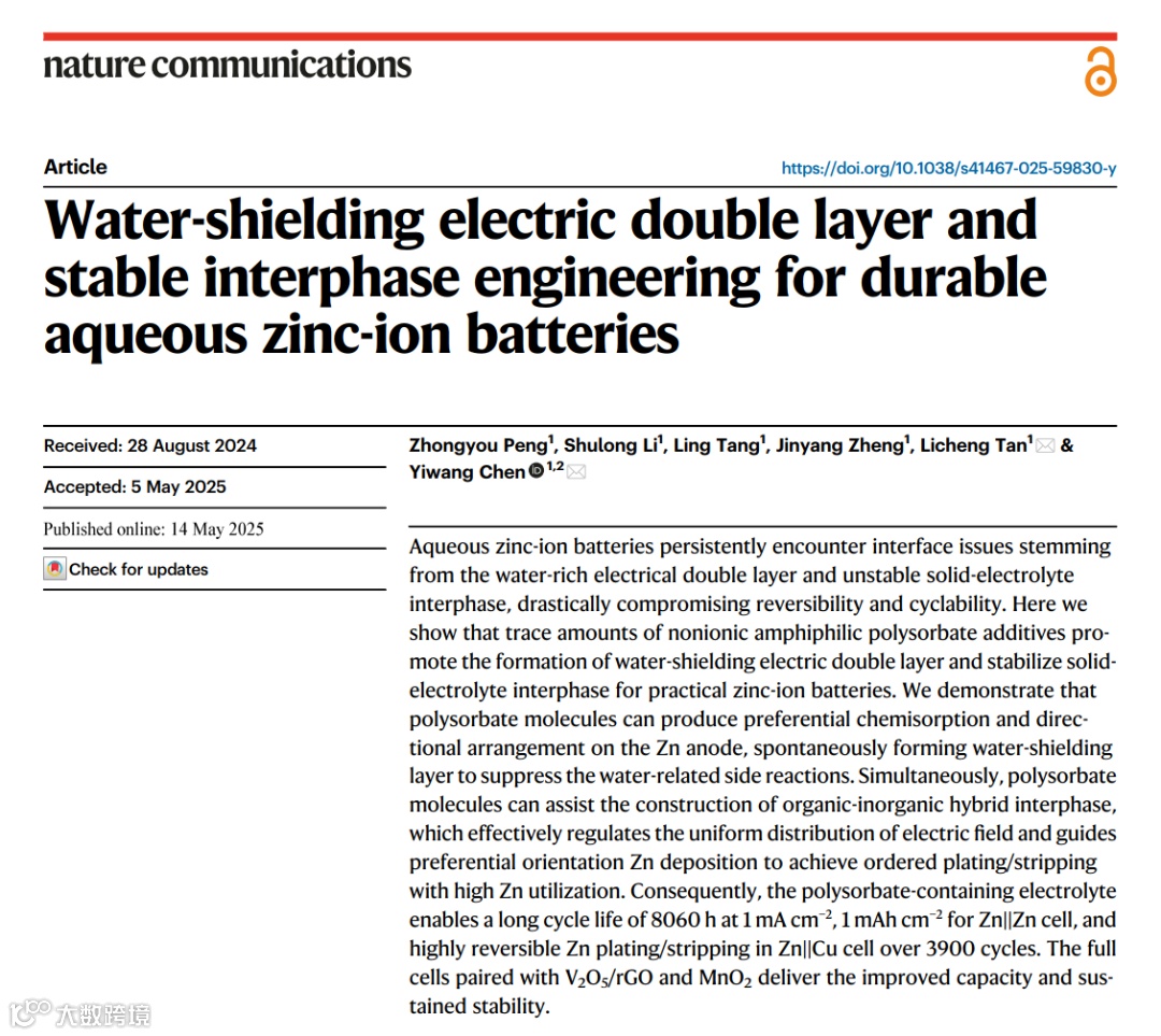 Zhongyou Peng, Shulong Li, Ling Tang, Jinyang Zheng, Licheng Tan*, Yiwang Chen*, Water-shielding electric double layer and stable interphase engineering for durable aqueous zinc-ion batteries, Nat Commun 16, 4490 (2025).