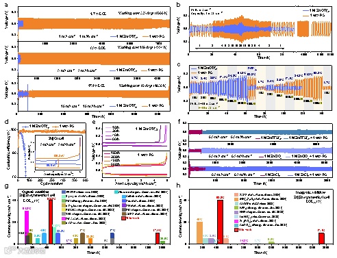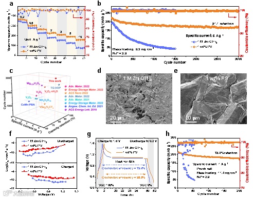 图5 高稳定及高利用率的锌金属电极。a Zn||Zn对称电池在1 M Zn(OTf)2电解液以及含1 wt% PS的电解液沉积/剥离电化学性能。b, c Zn||Zn对称电池在1 M Zn(OTf)2电解液以及含1 wt% PS的电解液沉积/剥离的倍率性能。d Zn||Cu电池在1 M Zn(OTf)2电解液以及含1 wt% PS的电解液的库仑效率,以及(e)不同循环次数下相应的电压曲线。f Zn||Zn对称电池在含有PS添加剂的不同锌盐电解液中循环电化学性能。g, h本研究与近期文献中电解液改性策略再循环可逆性方面对比分析。