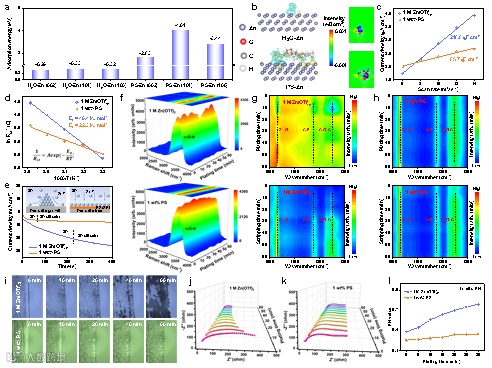 图3 含或不含有PS电解液中锌电极的稳定性及作用机理研究。a H₂O分子和PS分子在不同锌晶面上的吸附能比较。b H₂O分子和PS分子在锌(101)晶面的电荷密度差。c 在1 M Zn(OTf)2电解液以及含1 wt% PS的电解液中锌电极双电层电容。d 阿伦尼乌斯曲线以及活化能的比较。e 锌电极的计时电流曲线。f Zn2+沉积/剥离过程的原位拉曼光谱。g, h Zn2+沉积/剥离过程的原位FTIR光谱,i Zn2+沉积过程的原位光学显微镜图像。Zn||Zn对称电池在(j)1 M Zn(OTf)2电解液以及(k)含1 wt% PS的电解液原位EIS。l 在5 mA/cm²电流密度下锌电极表面实时pH值变化。