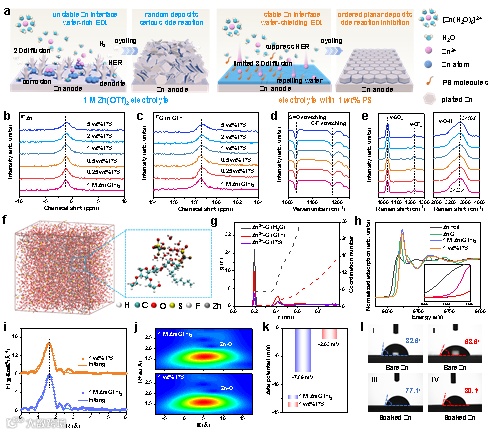 图1 电解液的表征与模拟。a 1 M Zn(OTf)2电解液以及含1 wt% PS的电解液对电解液与锌电极界面化学影响的示意图。b ⁶⁷Zn核磁共振谱,c ¹⁷O核磁共振谱,d 含不同PS浓度电解液的FTIR光谱,以及(e)含不同PS浓度电解液的拉曼光谱。f 含1 wt% PS的电解液MD模拟。g 从MD模拟获取的Zn²⁺-O的径向分布函数和配位数。h 经归一化处理的Zn K XANES光谱。i EXAFS曲线,以及(j)1 M Zn(OTf)2电解液以及含1 wt% PS的电解液的Zn K边XANES的小波变换结果。k 1 M Zn(OTf)2电解液以及含1 wt% PS的电解液Zeta电位。l 1 M Zn(OTf)2电解液在裸锌箔上的接触角(I)、预浸泡在1 M Zn(OTf)2电解液的锌箔上的接触角(III),含1 wt% PS的电解液在裸锌箔上的接触角(II)、预浸泡在含1 wt% PS的电解液锌箔上的接触角(IV)。