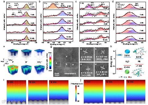 图4 稳定的固体电解质界面的结构表征及形成机理研究。锌电极在含有1 wt% PS的电解液中循环50次后的a C 1s,b F 1s,c S 2p和d O 1s的XPS。e 1 M Zn(OTf)2电解液以及(f)含1 wt% PS的电解液中循环50次后锌电极的ToF-SIMS。g 在含有1 wt% PS的电解液中循环50次锌电极的HRTEM图像。h H2O分子和PS分子的LUMO及HOMO等值面。i 1 M Zn(OTf)2电解液和(j)含有1 wt% PS的电解液中,锌电极锌沉积过程模拟电场分布情况。