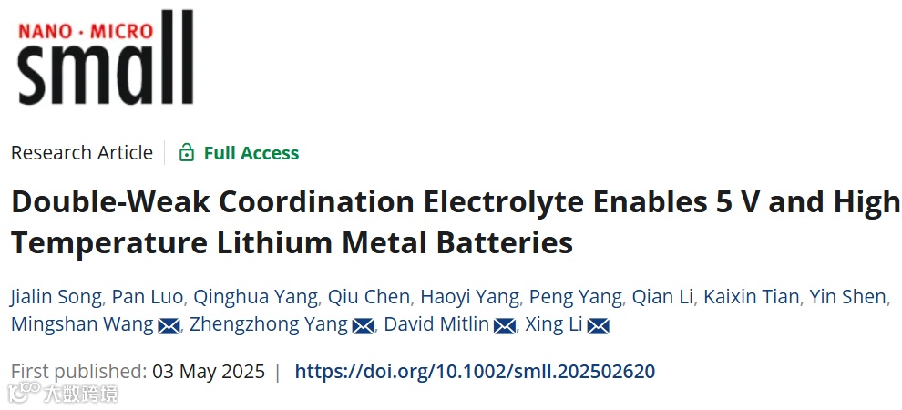 近日,西南石油大学的李星、王明珊团队、华中科技大学杨振中教授、美国德克萨斯大学David Mitlin教授,在国际知名期刊Small上发表题为“Double-Weak Coordination Electrolyte Enables 5 V and High Temperature Lithium Metal Batteries”的观点文章。通过磷酸三-(2,2,2-三氟乙基)酯(TFEP)的弱锂相互作用与温和亲锂位点的乙氧基五氟环三磷腈(PFPN)所引发的双弱配位,构建稳定的有机-无机杂化CEI,实现了层状氧化物正极材料的高电压高温联合运行。