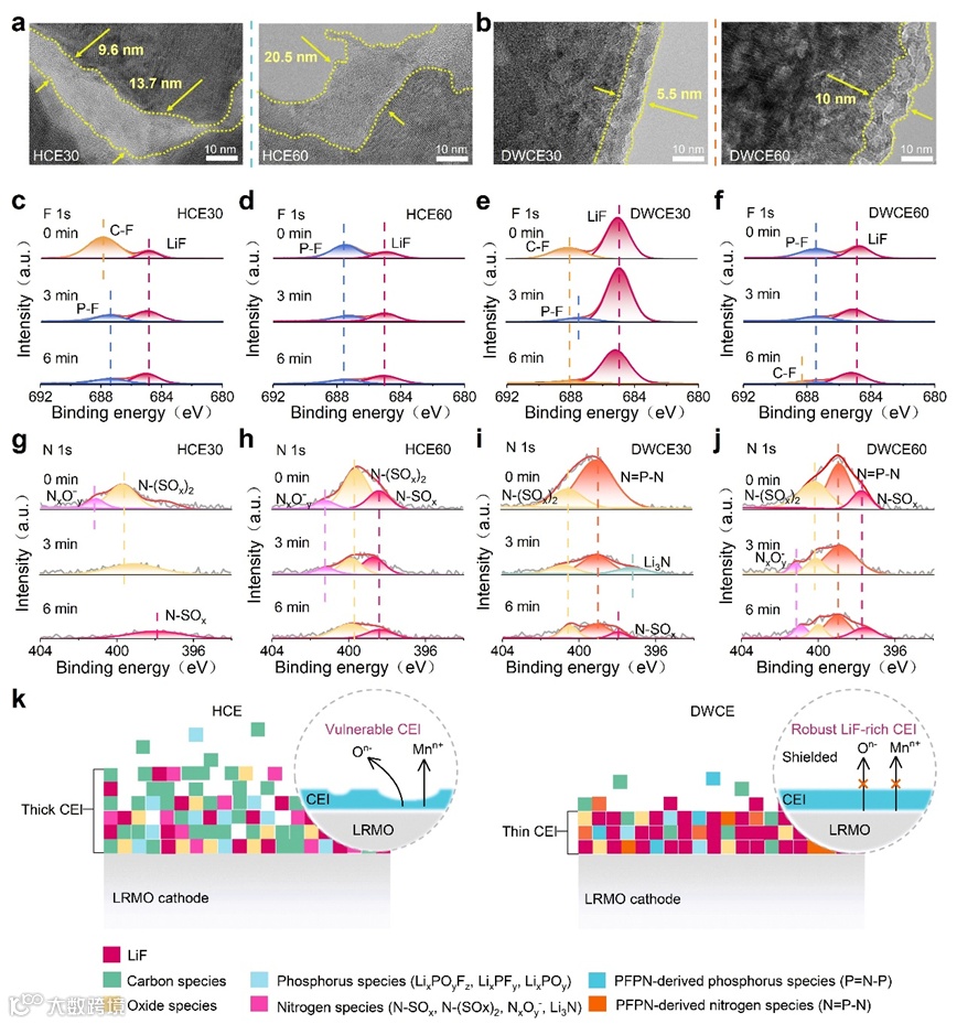 图4. (a) and (b) 5.0 V循环50周后LRMO正极材料的高分辨透射电镜(HR-TEM)图像:(a) HCE体系;(b) DWCE体系。(c)-(j) 5.0 V循环50圈后LRMO正极表面CEI膜的XPS组分分析:(c)-(f) F 1s能谱;(g)-(j) N 1s能谱(0、3、6 min代表不同溅射时间)。(k) HCE与DWCE体系形成的CEI结构及组分示意图。