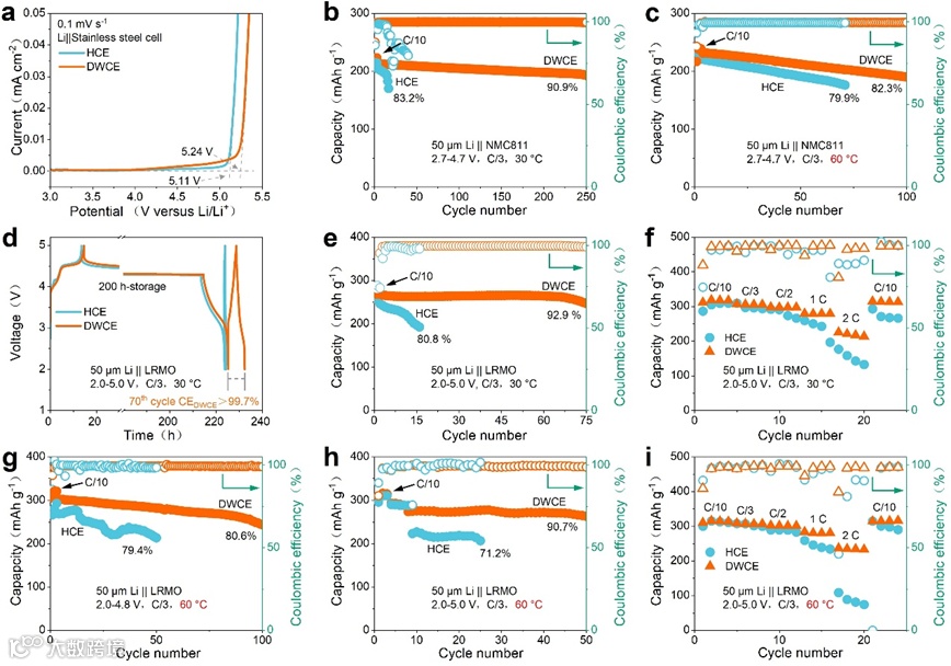 图3. (a) Li||不锈钢电池在30 °C下使用HCE和DWCE电解质的线性扫描伏安(LSV)曲线。(b) 4.7 V Li||NMC811(1.84 mAh cm-2)电池在30 °C下的循环稳定性对比(HCE vs DWCE)。(c) 4.7 V Li||NMC811(1.84 mAh cm-2)电池在60 °C下的循环性能比较。d) Li||LRMO(1.75 mAh cm-2)电池的自放电测试:电池先在0.1 C倍率下充电至5.0 V,随后在开路状态下静置200小时。(e) 自放电测试后,5.0 V Li||LRMO(1.75 mAh cm-2)电池在30 °C下的循环稳定性。(f) 5.0 V Li||LRMO(1.75 mAh cm-2)电池在30 °C下的倍率性能。(g) 4.8 V Li||LRMO(1.75 mAh cm-2)电池在60 °C下的长循环性能。(h) 5.0 V Li||LRMO(1.75 mAh cm-2)电池在60 °C下的循环稳定性测试。(i) 5.0 V Li||LRMO电池在60 °C下的倍率性能对比。