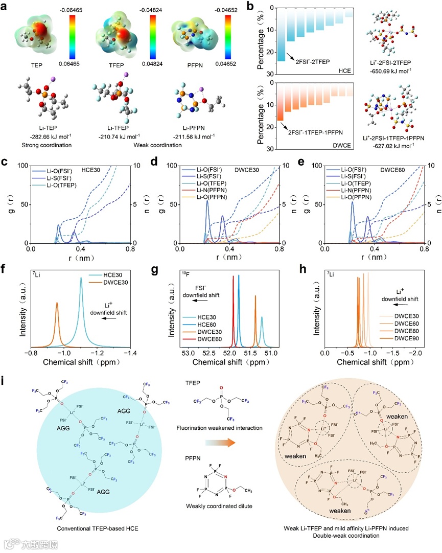 图1. (a) 上部分为TEP、TFEP和PFPN的静电势(ESP)分布,下部分为各分子与Li+的配位结合能。(b) 分子动力学模拟得到的HCE和DWCE可能存在的溶剂化结构分布。(c)-(e) 计算得到的径向分布函数(g(r))和配位数(n(r)):(c) HCE30体系,(d) DWCE30体系,(e) DWCE60体系(电解液体系在30°C和60°C下分别标记为HCE30、HCE60、DWCE30和DWCE60)。