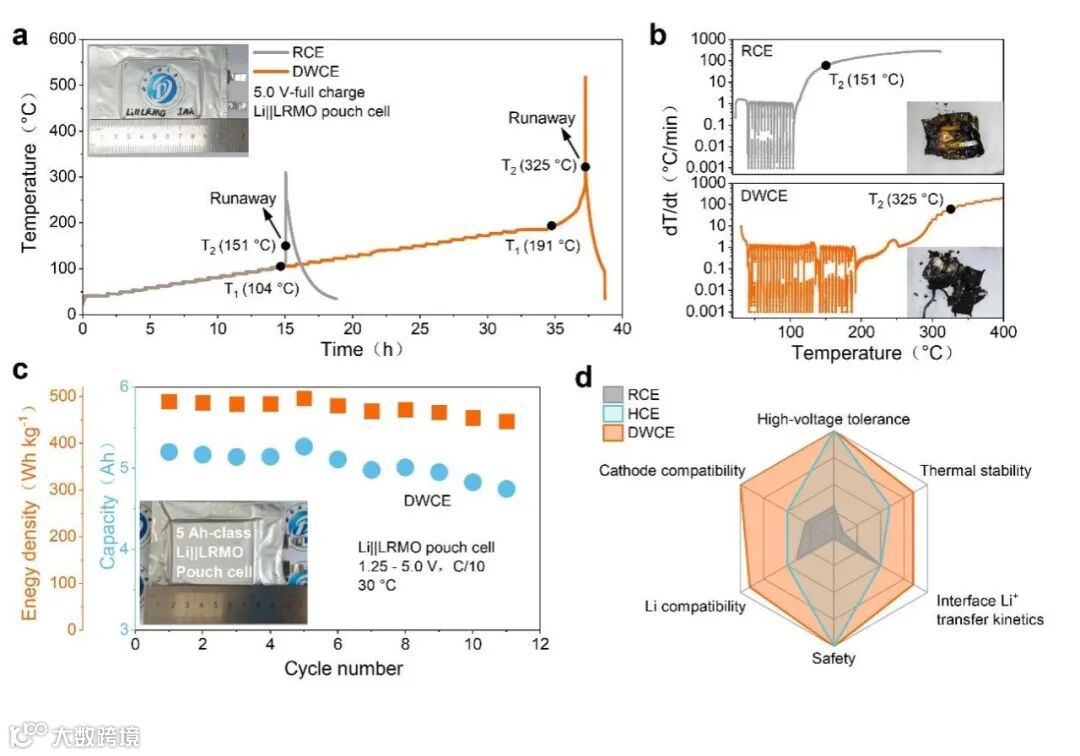 图6. (a) 基于加速速率量热仪(ARC)测试的1Ah Li||LRMO软包电池热失控安全风险分析。(b) 根据ARC结果绘制的RCE和DWCE体系软包电池的dT/dt-T曲线。(c) 5.2Ah Li||LRMO软包电池在1.25-5.0V电压范围、C/10倍率、30 °C条件下的循环性能。(d) 本工作中不同电解液体系的综合性能雷达图评估。