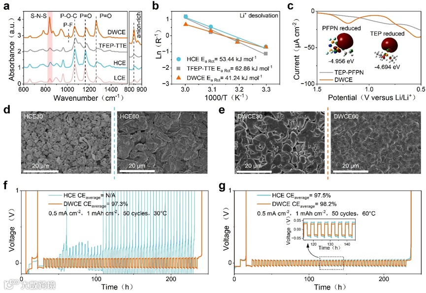 图2. (a) 不同电解质的傅里叶变换红外光谱(FTIR);(LCE:1 mol/L LiFSI/TFEP溶液;TFEP-TTE:LiFSI:TFEP:TTE=1:1.7:4,摩尔比)。(b) HCE、TFEP-TTE和DWCE体系的锂离子脱溶剂化活化能对比。(c) 采用TEP-PFPN和DWCE电解质的Li||Cu电池线性扫描伏安(LSV)曲线(扫描速率1 mV/s),电位范围为开路电位至0 V(vs. Li/Li+)。(TEP-PFPN:LiFSI:TEP:PFPN=1:1.7:4,摩尔比)。(d) and (e) 锂沉积形貌的俯视SEM图像:(d) HCE30和HCE60体系;(e) DWCE30和DWCE60体系。(f) and (g) Li||Cu电池库伦效率(CE)测试结果:(f) 30 °C和(g) 60 °C条件下,0.5 mA/cm-2电流密度和1 mAh/cm-2沉积容量,循环50次后的平均CE值。