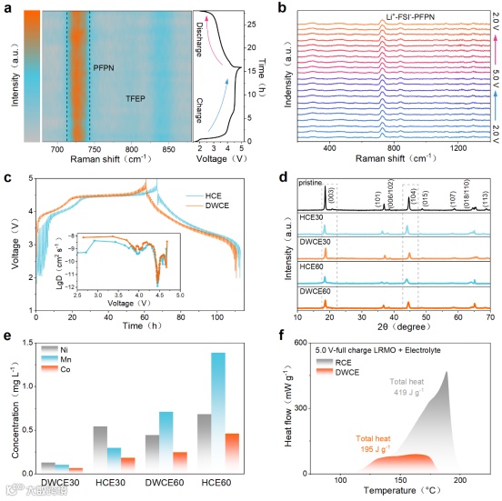 图5. (a) and (b) 采用DWCE电解液的Li||LRMO电池在0.1 C倍率、30 °C条件下的充放电过程原位拉曼光谱分析:(a) 680-880 cm-1波数范围内的二维彩色映射图;(b) 200-1400 cm-1波数范围内峰形随充放电状态的变化规律。(c) Li||LRMO(1.75 mAh cm-2)电池的恒电流间歇滴定技术(GITT)测试结果及充放电曲线对比(HCE vs DWCE)。(d) 原始LRMO材料与循环50圈后(HCE/DWCE体系)的X射线衍射(XRD)谱图对比。(e) LRMO正极在HCE和DWCE体系中的过渡金属溶出测试结果。(f) 充电至5.0 V的LRMO正极与相应电解液(70 μL)混合物的差示扫描量热(DSC)曲线(升温速率5°C /min,温度测试范围30-300°C)。