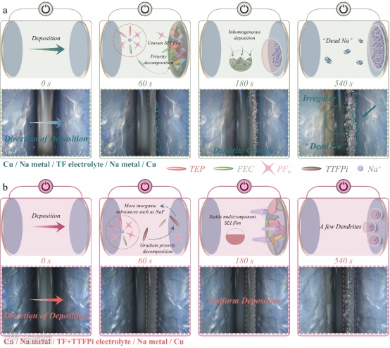图3. 钠对称电池在10 mA·cm−2电流密度下的原位光学显微镜图像及对应的沉积机理示意图:(a) TF电解液体系,(b) TF/TTFPi电解液体系。