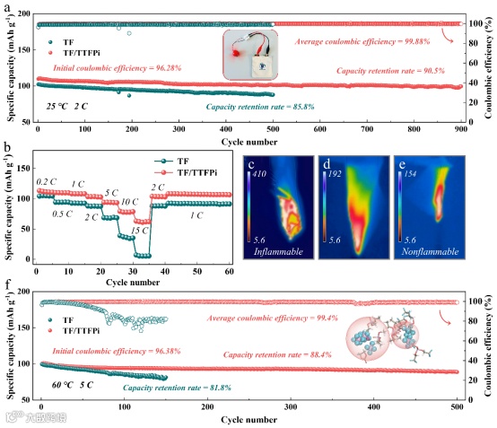 图7.(a)Na||NVP全电池在室温下的长循环稳定性。(b)倍率性能。(c-e)分别为ED电解液、TF电解液和TF/TTFPi电解液的红外热成像图。(f)Na||NVP全电池在60 ℃、5 C条件下的循环性能。