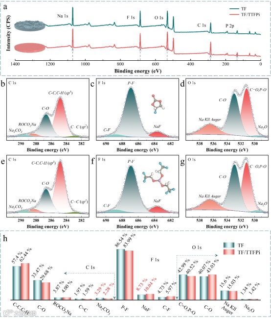 图5. 不同电解液体系下,全电池在2 C条件循环120圈后钠负极表面SEI膜的化学组成与半定量分析。(a)XPS全谱图。(b-d)采用TF电解液的钠负极的高分辨率C 1s、F 1s和O 1s谱图。(e-g)采用TF/TTFPi电解液的钠负极的高分辨率C 1s、F 1s和O 1s谱图。(h)TF与TF/TTFPi电解液条件下,钠负极表面C 1s、F 1s和O 1s成分所占比例。