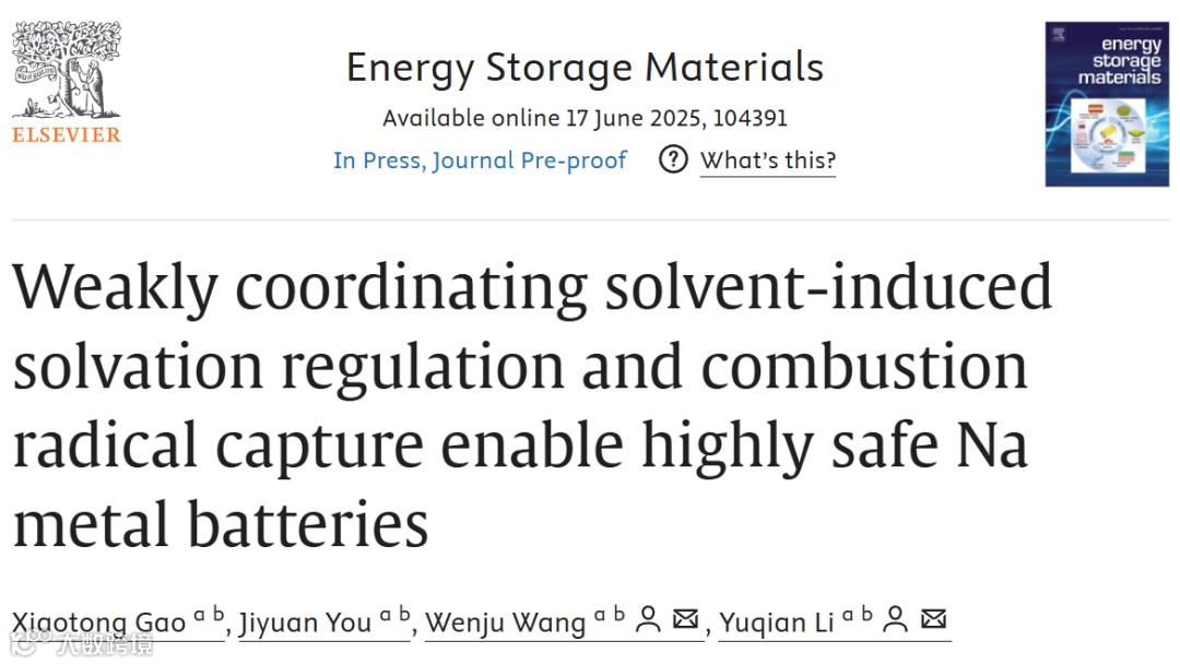 近日,来自南京理工大学的王文举、李玉倩团队,在国际知名期刊Energy Storage Materials上发表题为“Weakly coordinating solvent-induced solvation regulation and combustion radical capture enable highly safe Na metal batteries”的研究文章。该研究受到消防理念中“前端预防+后端控制”策略的启发,通过磷酸酯类不可燃溶剂实现电解液体系的溶剂重组,作为后端的阻燃手段;同时引入三(三氟乙基)亚磷酸酯(TTFPi)作为弱配位添加剂,调控Na+的溶剂化结构,从源头有效抑制枝晶生长。本研究结合理论计算与多种表征方法,系统阐明了TTFPi在界面结构调控与电化学性能优化中的作用机制,并在全电池体系中验证了该策略在常温与高温环境下的安全性与实用性,为高安全钠金属电池的设计提供了新思路与实验依据。