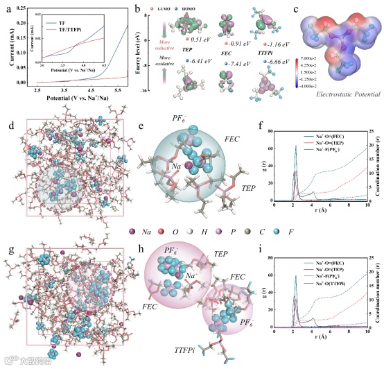 图2. (a) 不同电解液在5 mV·s−1扫描速率下的线性扫描伏安曲线。(b) TEP、FEC和TTFPi的前线分子轨道能级。(c) TTFPi的静电势分布图。依次展示 (d-f) TF电解液和 (g-i) TF/TTFPi电解液的分子动力学模拟快照、Na+局部溶剂化结构及径向分布函数曲线。