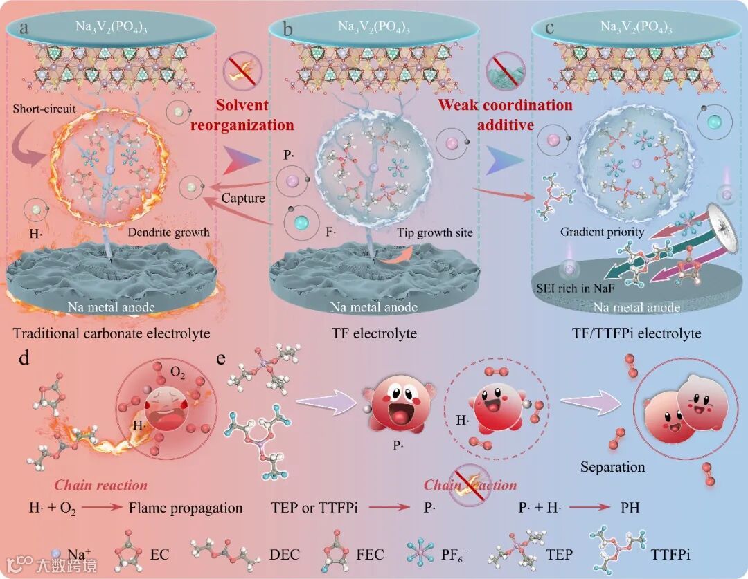 图1. (a–c) 采用两步法构建高安全性电解液的设计策略与机理示意图。(d) 链式反应过程。(e) 阻燃机制示意图。