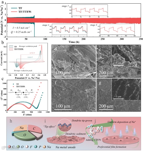 图4. (a) 不同电解液的Na||Na对称电池在0.5 mA·cm−2和0.25 mAh·cm−2条件下的恒电流测试。(b) TF和TF/TTFPi电解液的Na||NVP全电池在2.6-3.8 V电压范围和0.1 mV·s−1扫描速率下的初始循环CV曲线。(c) 不同电解液的Na||NVP全电池循环100次后的Nyquist图及拟合曲线。(d-e) TF电解液和 (f-g) TF/TTFPi电解液循环后钠阳极的SEM图像。(h) TF/TTFPi电解液中钠阳极表面元素原子比。(i) TF和 (j) TF/TTFPi电解液循环后电极表面钝化膜形成示意图。
