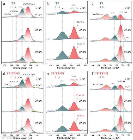图6. 钠负极在2 C条件下循环800圈后,高分辨率C 1s、F 1s和O 1s刻蚀XPS分析谱图:(a-c)为TF电解液体系,(d-f)为TF/TTFPi电解液体系。