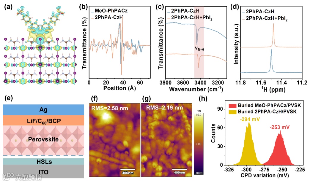 图3 (a) 2PhPA-CzH 与钙钛矿接触时的电荷密度差示意图。蓝色等值面表示电子耗尽,黄色表示电子积累。(b) HSL/钙钛矿界面的差分电荷密度。(c) 2PhPA-CzH 分子及其与 PbI₂ 复合材料的 FTIR 谱图。(d) 在 DMSO-d₆ 中的¹H-NMR 谱图。(e) p-i-n 结构 PSCs 的堆叠示意图。(f) 在 ITO/MeO-PhPACz 和 (g) ITO/2PhPA-CzH 上沉积的埋底钙钛矿薄膜的 AFM 图像。(h) 埋底钙钛矿薄膜的表面接触电位差(CPD)。
