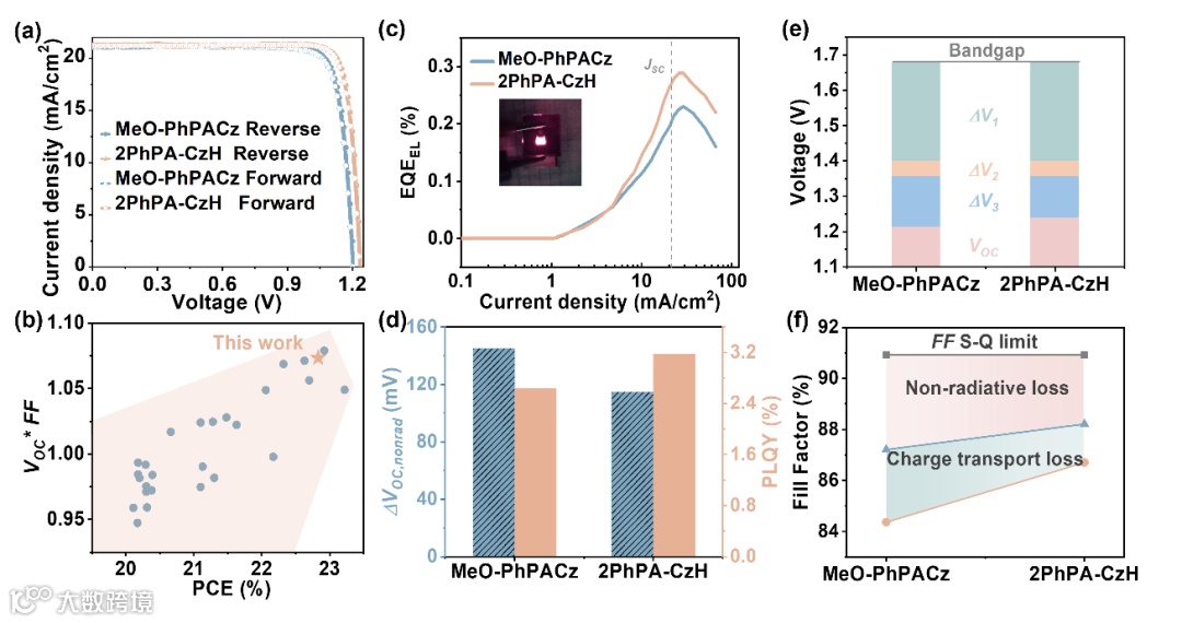 图4 (a) 在模拟 AM 1.5 G 太阳光照(100 Mw/cm2)下正反扫描方向的 J-V 曲线。(b) 近年报道的 1.68 eV 宽带隙钙钛矿的 VOC*FF 统计。(c) 器件作为 LED 运行时的 EQEEL。插图是发光 PSC 的照片。(d) 基于 MeO-PhPACz 和 2PhPA-CzH 作为 HSL 层的钙钛矿薄膜的非辐射复合VOC 损失。(e) VOC、(f) FF 损失分析。