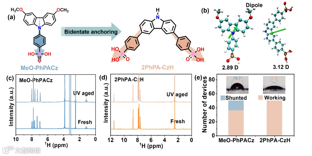 图1 (a) 弱亲水结构设计的分子策略。(b) MeO-PhPACz(左)和 2PhPA-CzH(右)的偶极矩。(c)和(d)紫外线照射前后的¹H-NMR 谱图。e) 不同 HSL 上沉积的器件的制造产量。插图:相应水接触角的照片。