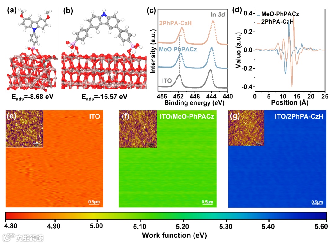 图2 (a)和(b) MeO-PhPACz和2PhPA-CzH在 ITO 表面上的吸附模式。(c) ITO、MeO-PhPACz 和 2PhPA-CzH 处理的 ITO 的 In 3d 谱图。(d) ITO/HSL 界面的差分电荷密度。(e)-(g) ITO 和用 MeO-PhPACz 和 2PhPA-CzH 功能化的 ITO 的功函数(WF)分布,基于 KPFM 测量。