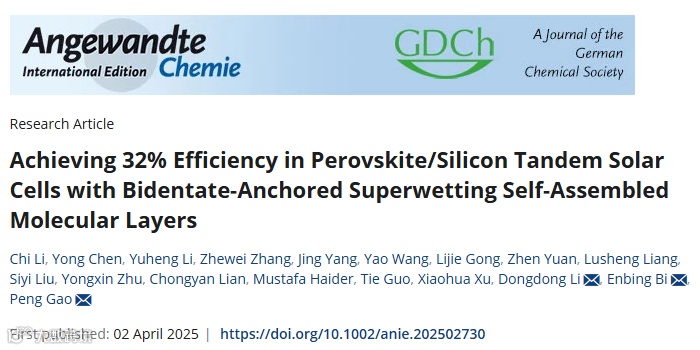 基于此,来自中科院福建物质结构所高鹏研究员联合宣城先进太阳能技术研究所毕恩兵博士和张江实验室李东栋研究员,在国际知名期刊Angewandte Chemie International Edition上发表题为“Achieving 32% Efficiency in Perovskite/Silicon Tandem Solar Cells with Bidentate-Anchored Superwetting Self-Assembled Molecular Layers”的研究文章。