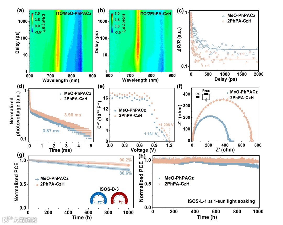 图5 基于瞬态反射(TR)光谱学的伪彩色图,显示在不同基底上沉积的钙钛矿薄膜在不同探测波长和泵浦-探测延迟下的反射率变化(ΔR/R):(a) ITO/MeO-PhPACz,(b) 2PhPA-CzH,(c) 从 TR 光谱学提取的归一化表面载流子动力学。(d) 瞬态光电压。(e) Mott–Schottky 图。(f) 电化学阻抗谱(EIS),插图是等效电路,其中 RS是串联电阻,Rrec 是电荷复合电阻,Nyquist 图中的拟合结果用实线表示。(g) 在约 85% RH 和 85°C 下自然昼夜循环的封装 PSCs 的湿热稳定性测试。(h) 在氮气环境中 RT 下 1 Sun 照明下的最大功率点(MPP)的稳定功率输出。