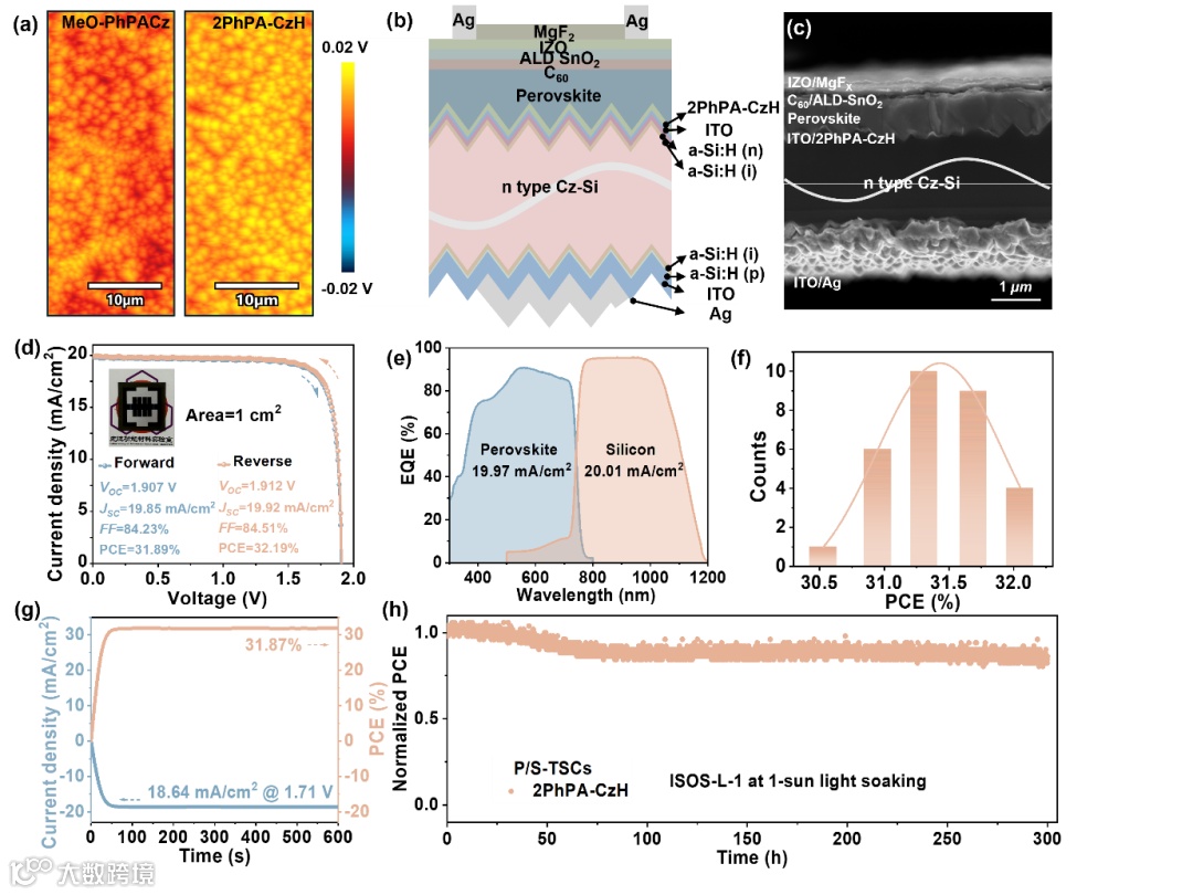 图6 P/S-TSCs 的性能和稳定性表征。(a) MeO-PhPACz(左)和 2PhPA-CzH(右)的 AFM-IR 图像。(b) P/S-TSCs 的示意图。(c) P/S-TSCs 的横截面 SEM 图像,显示完整的钙钛矿和功能层。(d) 最佳 2PhPA-CzH 基 P/S-TSCs 的 J-V 曲线。插图是 P/S-TSCs 的照片。(e) 基于 2PhPA-CzH HSL 的最佳 P/S-TSCs 的钙钛矿和硅子电池的 EQE 谱图。(f) 2PhPA-CzH 基 P/S-TSCs 的 PCE 直方图。(g) P/S-TSCs 在最大功率点的稳定功率输出随时间的变化。(h) 在氮气环境中 RT 下 1 Sun 照明下的最大功率点的稳定功率输出。