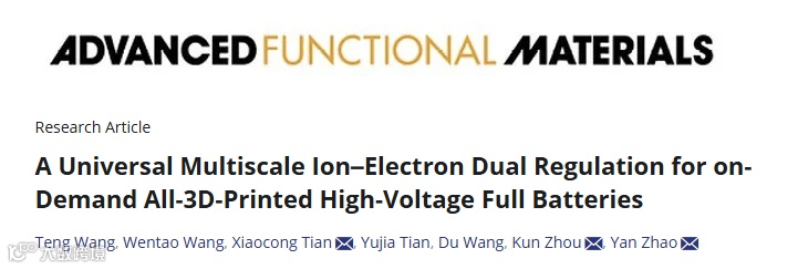 近日,武汉大学赵焱教授、新加坡南洋理工大学周琨教授和武汉理工大学田晓聪教授等在《Advanced Functional Materials》期刊上发表了题为“A Universal Multiscale Ion–Electron Dual Regulation for on-Demand All-3D-Printed High-Voltage Full Batteries”的文章。该工作提出了一种通用多尺度离子–电子双重调控策略,该策略以NCM为高压正极材料代表,通过优化打印浆料配方及数字化设计电极微结构,构建出按需调控的高负载电极架构与多维导电网络。在此基础上,构筑的3D导电网络展现出优异的储能性能,包括高比容量、优良倍率性能以及超过10000次循环的卓越稳定性。这些性能提升得益于离子与电子传输路径的高效协同,该机制亦通过有限元仿真得到了验证。进一步将其组装为全3D打印高电压全电池后,实测可逆容量达164.5 mAh g-1,且在5000次循环后仍保持85.5 %的容量。值得一提的是,该策略具备良好的材料兼容性和工艺可扩展性,可适用于其他电极材料体系,为推动3D打印储能器件的通用化、智能化与可持续化制造提供了新思路与技术支撑。