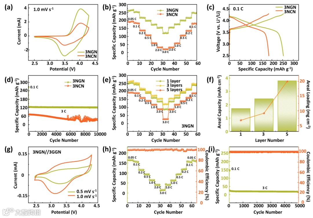 通过在微尺度上引入三维石墨烯网络(3NGN)或三维碳纳米管网络(3NCN),实现电极中离子与电子双通路协同优化。其中,石墨烯片层构建出贯通型低曲折度孔道网络,显著提升离子通透性;相较而言,CNTs网络能增强电极内部的电子连通性。二者与NCM颗粒形成稳定复合结构,成功实现高比容量,并展现出兼顾高负载、高倍率与长寿命性能的可调控导电网络范式。