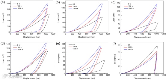 图4 Ni-YSZ阳极/SrO-MgO-SiO2玻璃/430不锈钢系统在固定深度模式下的纳米压痕载荷-位移曲线:(a)阳极内部;(b)阳极侧界面;(c)玻璃/阳极侧界面;(d)玻璃内部;(e)玻璃/连接体侧界面;(f)430不锈钢。