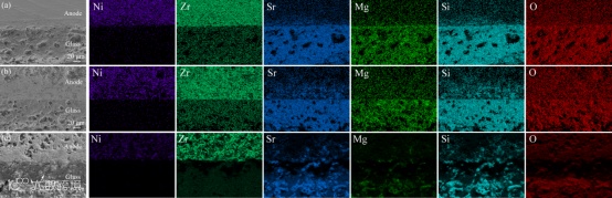 图3 Ni-YSZ阳极/SrO-MgO-SiO2玻璃界面在还原气氛中运行不同时间后的截面形貌及相应区域EDS面扫描分析:(a) 0 h;(b) 100 h;(c) 1800 h。
