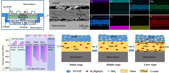 玻璃中Sr、Mg、Si元素向Ni-YSZ阳极渗透(深度达40 μm),界面硬度从3.4 GPa升至8.4 GPa,同时阳极中Ni偏析与孔隙率增加导致模量先升后降(运行1800小时降至128.3 GPa)。界面处形成Sr₂MgSi₂O₇与SiO₂混合相,应力在界面处集中。