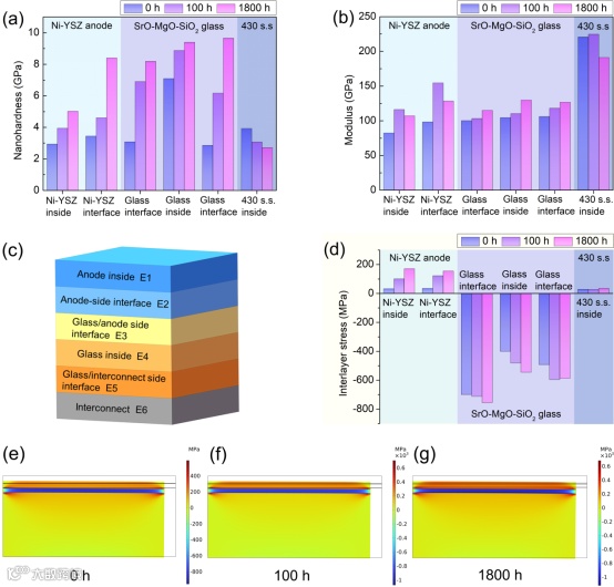 图5 Ni-YSZ阳极/SrO-MgO-SiO2玻璃/430不锈钢密封系统的力学性能和层间应力:(a)纳米硬度;(b)弹性模量;(c)层间应力模型示意图;(d)不同接触界面间层间应力分布;(e) 0 h层间应力仿真结果;(f) 100 h层间应力仿真结果;(g) 1800 h层间应力仿真结果。