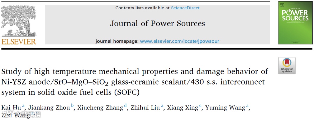 清华大学王子羲副研究员,在国际知名期刊《Journal of Power Sources》上发表题为“Study of high temperature mechanical properties and damage behavior of Ni-YSZ anode/SrO–MgO–SiO2 glass-ceramic sealant/430 s.s. interconnect system in solid oxide fuel cells (SOFC)”的研究文章。研究了玻璃陶瓷晶化、成分扩散及连接体力学性能退化过程对Ni-YSZ阳极/SrO–MgO–SiO₂密封材料/430不锈钢连接体系统界面结构和力学状态的影响,基于不同界面力学状态变化,建立密封系统层间应力模型,揭示密封系统界面结构损伤机制,为优化固体氧化物燃料电池密封系统设计及材料选择提供关键数据及理论支持。